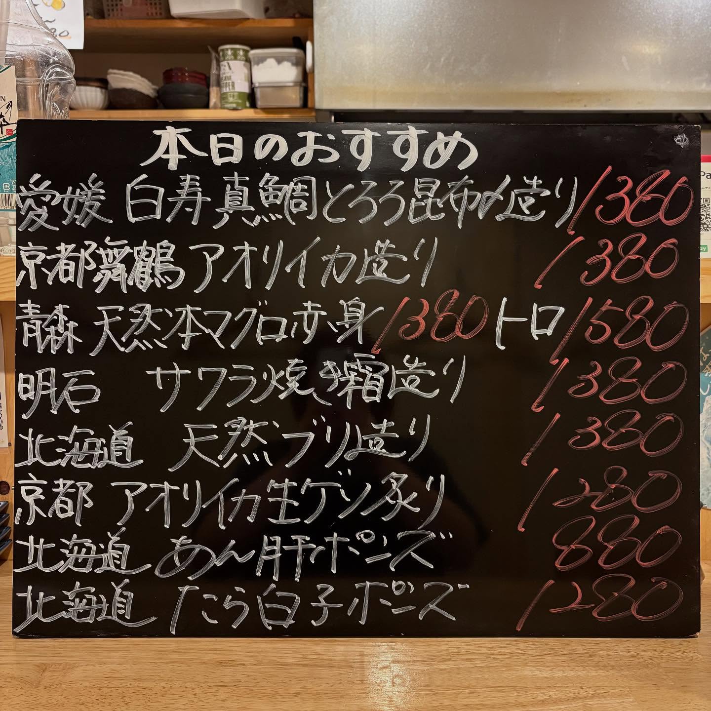 本日のおすすめ ︎北海道 天然ブリ造り ︎愛媛 白寿真鯛とろろ…